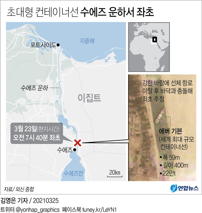 이집트 수에즈 운하에는 지난 23일(현지시간) 오전 파나마 선적의 22만4천t 규모 컨테이너선 에버 기븐호가 좌초해 통항이 중단되는 등 물류에 막대한 차질을 빚고 있다.