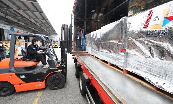 ▲ 24일 오후 인천국제공항 보세창고에서 관계자들이 코로나19 경구용(먹는) 치료제 '라게브리오' 2만160명분을 오창 물류센터로 보내기 위해 수송차량으로 옮기고 있다. [영종도=연합뉴스]