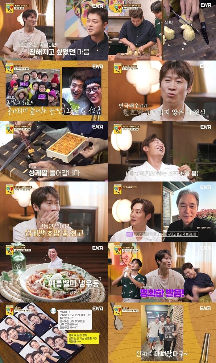 애피타이저에 이어 전현무는 “오늘 돈 많이 썼다”며 아낌없이 주는 ‘에르무스 초밥’ 코스의 시작을 알렸다. 진선규-이희준은 탱글탱글 한 제주산 도미 초밥을 먹으면서 젊음을 불살랐던 연극배우 시절을 회상했다. 두 사람은 “월급 30만원을 받던 때다. 차고를 개조해서 공연을 했다”고 말했다. 그런데 이때 이희준은 “극단에서 선규 형이 인기가 제일 많아서 질투했다. 내가 술값도 훨씬 자주 냈는데 형이 낼 때만 꼭 소문이 났다”고 억울함을 호소해 모두를 폭소케 했다.