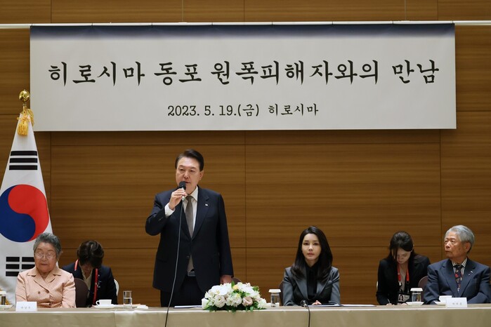 윤석열 대통령이 방일 첫날인 19일 일본 히로시마에서 역대 대통령 중 처음으로 원폭 피해 동포들을 만났다.