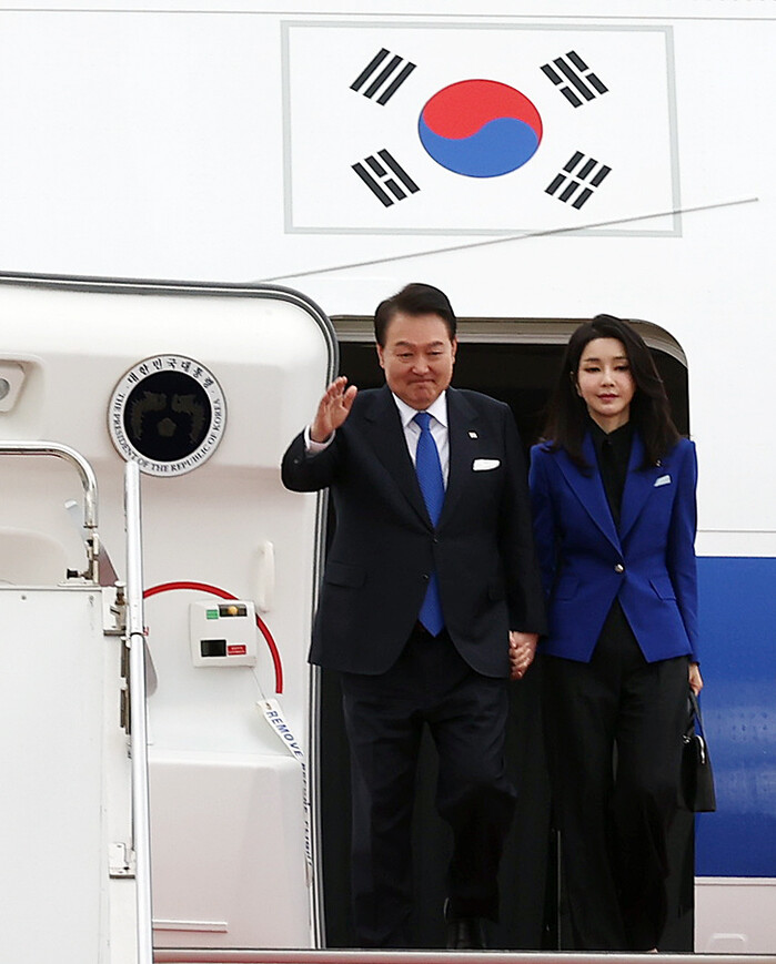 | ▲ 주요 7개국(G7) 정상회의에 참석하는 윤석열 대통령과 김건희 여사가 19일 일본 히로시마공항에 도착, 공군 1호기에서 내리며 영접인사들에게 손을 들어 인사하고 있다. [히로시마=연합뉴스] |