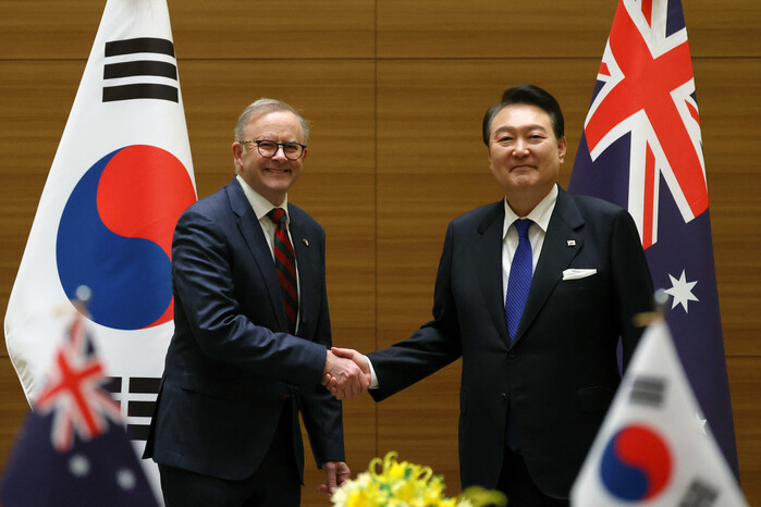 | ▲ 주요 7개국(G7) 정상회의 참석차 일본을 방문한 윤석열 대통령과 앤서니 앨버니지 호주 총리가 19일 히로시마 한 호텔에서 열린 한-호주 정상회담에서 악수하고 있다. [히로시마=연합뉴스] |