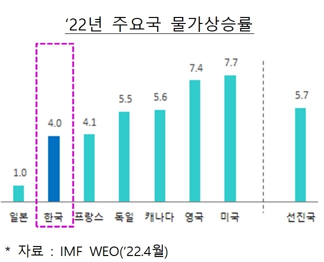한국의 올해 물가상승률 전망치는 미국(7.7%), 영국(7.4%), 캐나다(5.6%), 독일(5.5%), 프랑스(4.1%)보다는 낮으나 일본(1.0%)보다는 높은 수치다.