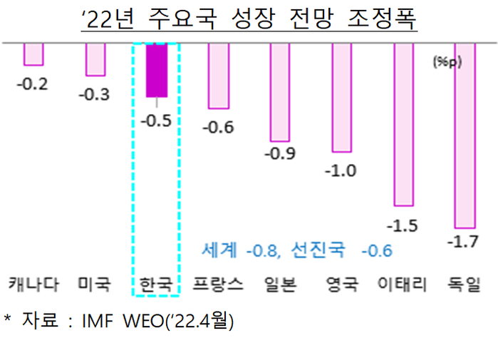 한국의 하향 조정폭은 독일(-1.7%p), 이탈리아(-1.5%p), 영국(-1.0%p), 일본(-0.9%p), 프랑스(-0.6%p) 등 주요 선진국에 비해 상대적으로 적다. 미국(-0.3%p), 캐나다(-0.2%p)보다는 조정폭이 크다.