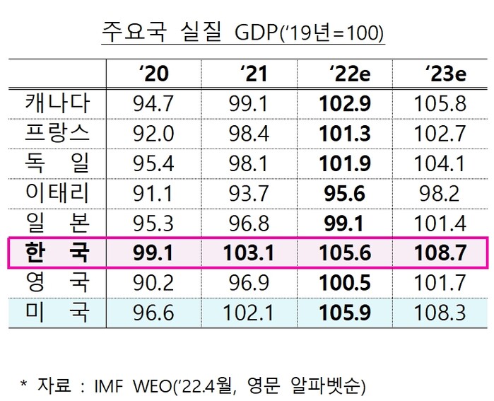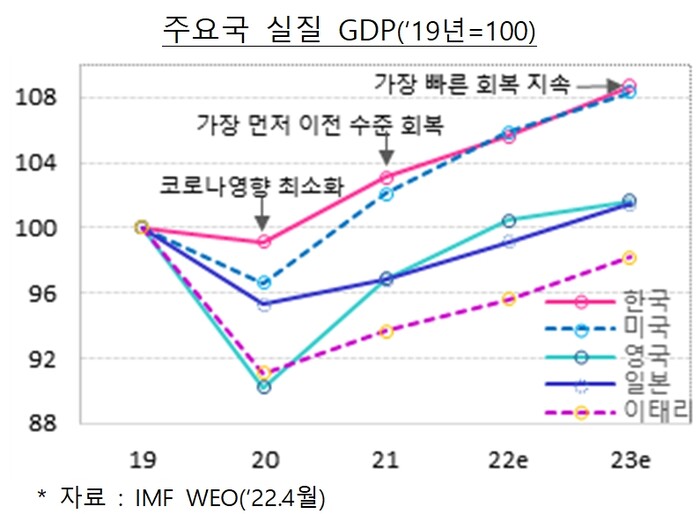 한국은 2020년엔 주요 선진국 중 코로나 상흔을 최소화하는데 성공했으며, 2021년엔 가장 먼저 코로나 이전 수준을 회복했다.
