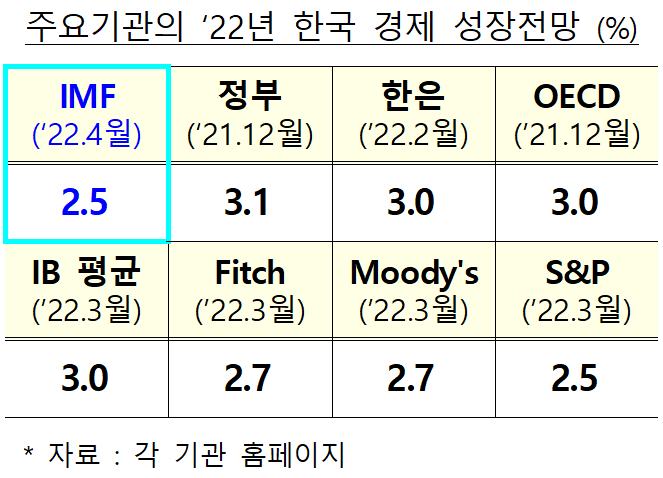 이번 IMF의 한국 성장률 전망치를 올해 국내외 주요 기관의 전망치와 비교하면 정부(3.1%), 한국은행(3.0%), 경제협력개발기구(OECD)(3.0%), 투자은행(IB) 평균(3.0%), 피치(2.7%), 무디스(2.7%)보다는 낮고, 스탠더드앤드푸어스(S&P)(2.5%)와 같은 수치다.