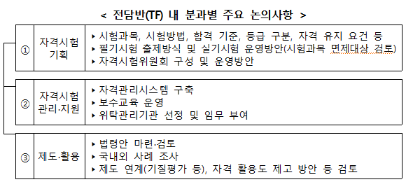 전담반은 송남근 동물복지환경정책관을 팀장으로 학계, 행동지도 전문가, 자격 전문가, 유관 단체 등 20여 명의 외부 전문가로 구성되며 자격시험 기획, 자격시험 관리·지원, 제도·활용 등 3개 분과로 운영된다.
