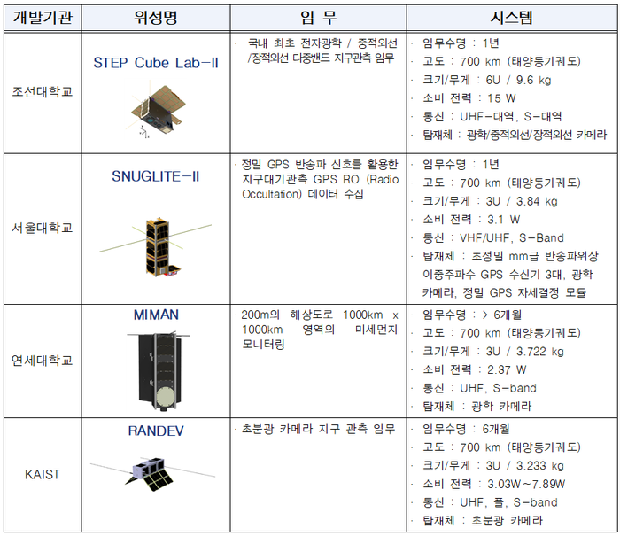 큐브위성 4기는 조선대, 서울대, 연세대, KAIST 등 국내 4개 대학의 학생들이 약 2년 동안 개발한 것으로, 과기정통부에서 우주전문인력 양성의 일환으로 추진됐다.