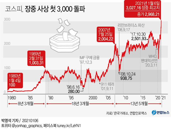 | ▲ 코스피 지수 역대 추이 및 주요 이정표. [그래픽= 연합뉴스] |