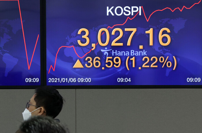 하지만 이날 코스피는 전날보다 2.77포인트(0.09%) 오른 2,993.34로 개장한 뒤 곧바로 개인 매수세에 힘입어 사상 처음 3000을 돌파했다. 장중 최고치는 3027.16이었다.