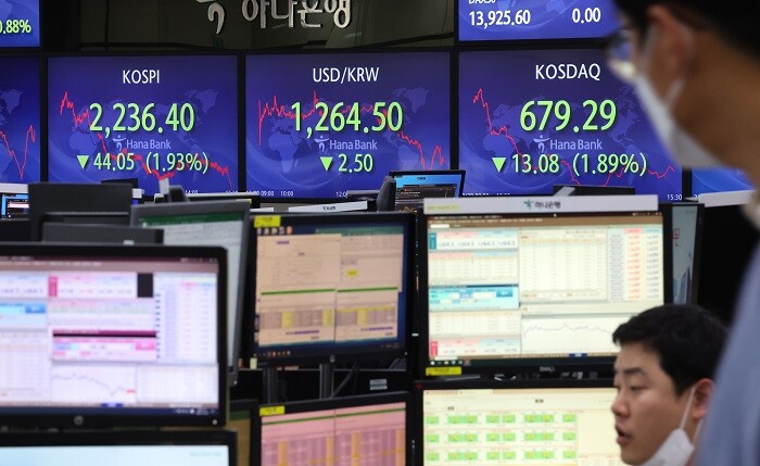 ▲ 2023년 새해엔 증권거래세가 0.23%에서 0.20%로 내려간다. 반면 금융투자소득세(금투세)와 가상자산 과세는 2025년까지 2년간 유예된다. 사진은 29일 서울 명동 하나은행에서 직원들이 증시 및 환율 지수를 모니터하고 있는 모습. 이날 코스피는 전장보다 44.05포인트(1.93%) 내린 2236.40에 거래를 마쳤다. 코스피가 종가 기준 2250선 밑으로 내려간 것은 10월 26일(2249.56) 이후 약 2개월 만이다. [서울=연합뉴스] |