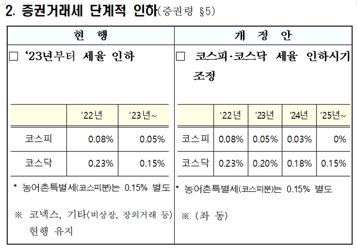 당초 23년부터 금투세가 되입되면 증권거래세율은 곧바로 0.23%에서 0.15%로 낮아질 예정이었다.