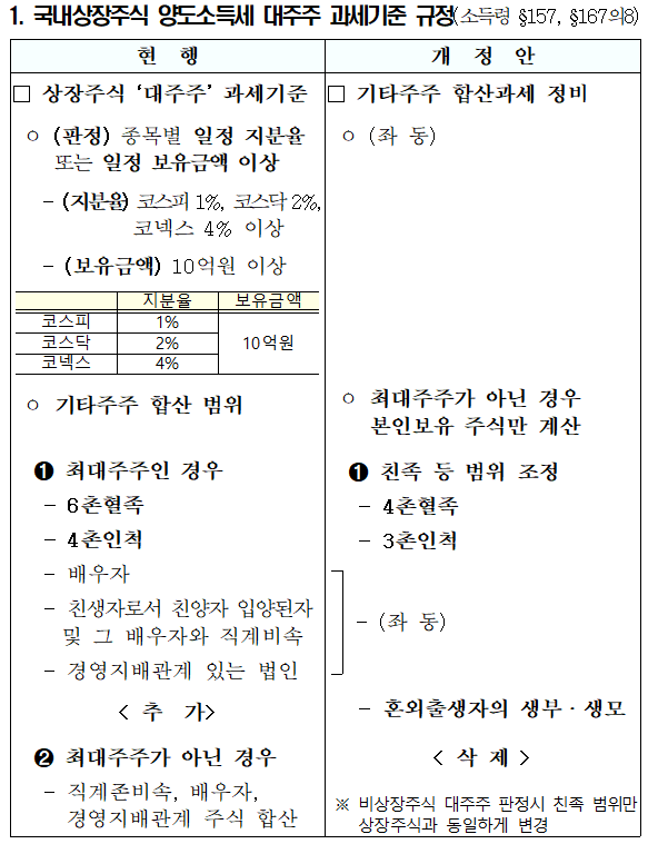 이번 소득세법 시행령에는 국내상장주식 양도소득세 대주주 판정 시 가족 등 기타주주 합산을 폐지하되, 최대주주의 경우에는 공정거래법령의 친족범위 변경에 맞춰 합리적으로 조정하는 내용도 담겼다.