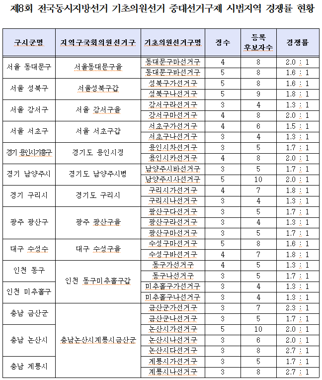 ▲ 제8회 전국동시지방선거 기초의원선거 중대선거구제 시범지역 경쟁률 현황. [중앙선거관리위원회 제공] |