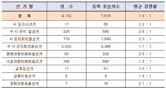 선출 정수가 4132명이어서 평균 경쟁률은 1.8대1을 기록했다. 이는 역대 최저 경쟁률 기록이었던 2014년 제6회 지방선거 당시 2.3대 1보다 낮은 수치다.