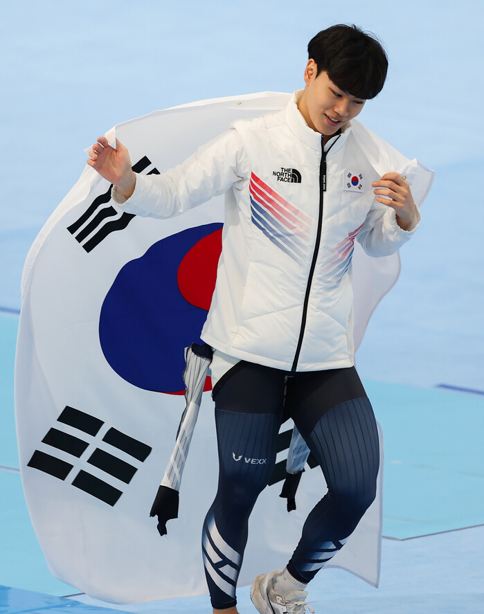 | ▲ 김민석이 8일 오후 중국 베이징 국립 스피드스케이팅 경기장(오벌)에서 열린 2022 베이징 동계올림픽 스피드스케이팅 남자 1500m 경기에서 동메달을 획득한 후 태극기를 두르고 자축하고 있다. [베이징=연합뉴스] |