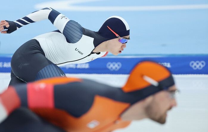 | ▲ 김민석이 8일 오후 중국 베이징 국립 스피드스케이팅 경기장(오벌)에서 열린 2022 베이징 동계올림픽 스피드스케이팅 남자 1500m 경기에서 아웃 코스의 네덜란드 키엘드 나위스(아래)와 곡선 주로를 돌고 있다. [베이징=연합뉴스] |