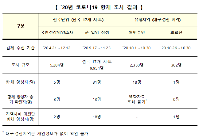 육군 훈련소 입영 장정 9954명에 대한 조사(20.9.17∼20.11.23)에서는 항체 보유자가 31명(0.31%)으로 파악됐다. 이 가운데 기확진자는 13명이었고 미확진자는 18명이었다.