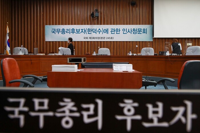 ▲ 한덕수 국무총리 후보자에 대한 인사청문회를 하루 앞둔 24일 서울 여의도 국회 제3회의장에서 국회 직원들이 인사청문회 준비를 하고 있다. [국회사진기자단=연합뉴스] |