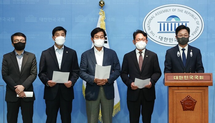 ▲ 국무총리 후보자 한덕수 인사청문특위 더불어민주당과 정의당 의원들이 24일 국회 소통관에서 오는 25일과 26일로 예정된 한덕수 후보자 인사청문회와 관련해 자료제출을 촉구하는 합동 기자회견을 하고 있다. 오른쪽부터 더불어민주당 강병원 의원, 정의당 배진교 원내대표, 더불어민주당 신동근 의원, 이해식 의원, 김의겸 의원. [국회사진기자단=연합뉴스] |