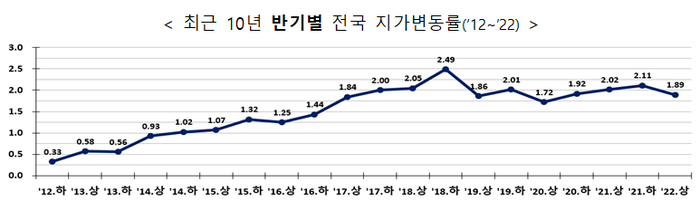 ▲ 최근 10년 반기별 전국 지가변동률. [국토교통부 제공] |