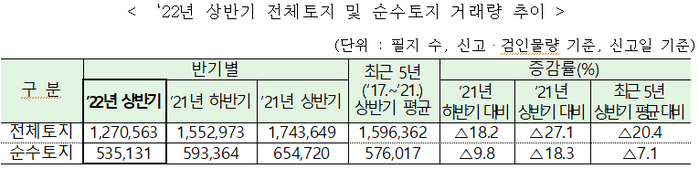 ▲ 2022년 상반기 전체토지 및 순수토지 거래량 추이. [국토교통부 제공] |