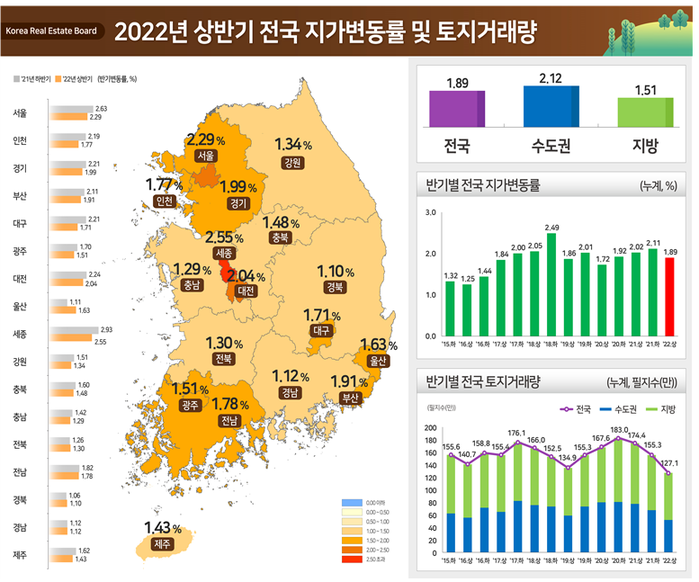 국토교통부가 25일 발표한 ‘2022년 상반기 전국 지가(땅값) 변동률 및 토지거래량’ 통계에 따르면, 올해 상반기 전국 지가는 1.89% 상승했다.