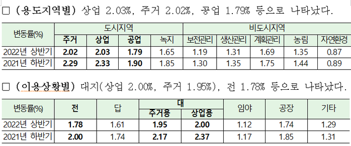 ▲ 상반기 용도지역별, 이용상황별 지가 변동률. [국토교통부 제공] |