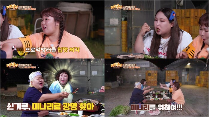 신기루의 현실 부부 에피소드에 모두가 ‘입틀막’한 가운데, 신기루는 미나리쌈을 만들어 “미나리를 위하여~”라고 선창하며 건배를 외친다. 그러면서 “미나리는 (아무리 먹어도) 배가 안 부른 것 같다”고 분위기를 띄운다. 이에 풍자는 “언니가 배부름을 알아?”라고 먹방 배틀을 신청(?)해, 티키타카를 폭발시킨다.