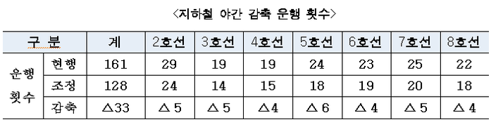 ▲ 지하철 야간 감축 운행 횟수. [서울시 제공] |