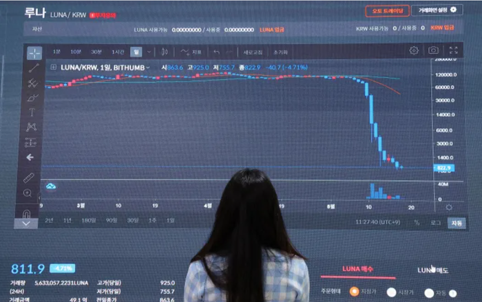 | ▲ 2022년 5월 서울 서초구 빗썸 고객센터 전광판에 폭락한 루나 차트가 띄워져 있다. [사진=연합뉴스] |
