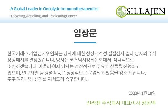 이에 신라젠은 공식 입장문을 통해 “당사는 코스닥시장위원회에서 적극적으로 소명하겠다”고 밝혔다.