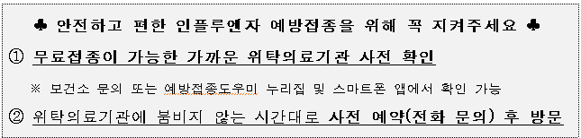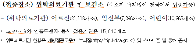 인플루엔자 국가예방접종은 지정된 동네 병·의원이나 보건소에서 실시하며, 위탁의료기관은 예방접종도우미 누리집이나 예방접종도우미 앱에서 조회가 가능하다. 위탁의료기관은 어르신 대상 2만1118곳, 임신부 대상 7296곳, 어린이 대상 1만365곳이다.