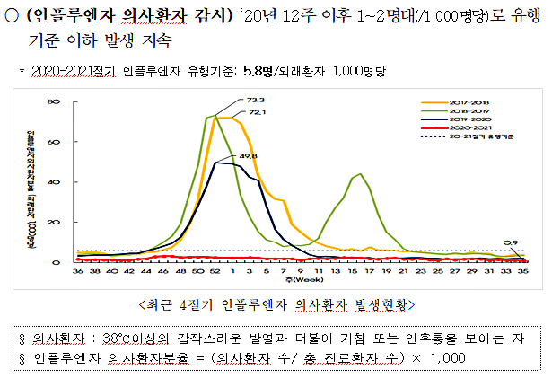 김기남 코로나19 예방접종대응추진단(추진단) 접종기획반장은 13일 정례 브리핑에서 “지난 절기에는 국내에 인플루엔자 발생이 매우 낮았다. 이는 코로나19로 인한 거리두기, 개인 위생수칙 준수, 해외여행 감소 등이 주요한 영향이었다”며 “이런 것들이 지속되면 금년에도 인플루엔자 발생은 예년보다 낮을 것으로 전망된다”고 밝혔다.
