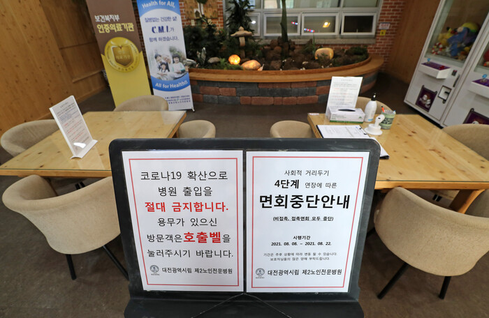 ▲ 11일 오후 대전시 동구 하소동 제2시립노인전문병원 면회실에 운영 중단 안내문이 놓여있다. [대전=연합뉴스] |