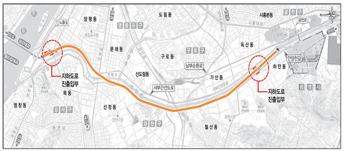 ▲ 서부간선지하도로 진출 입구 (금천구 독산동 종점부). [서울시] |