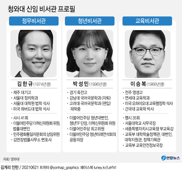 문재인 대통령은 21일 청와대 정무비서관에 의정 경험이 없는 김한규 김앤장법률사무소 변호사를, 청년비서관에 20대 대학생인 박성민 전 더불어민주당 최고위원을 각각 내정했다.