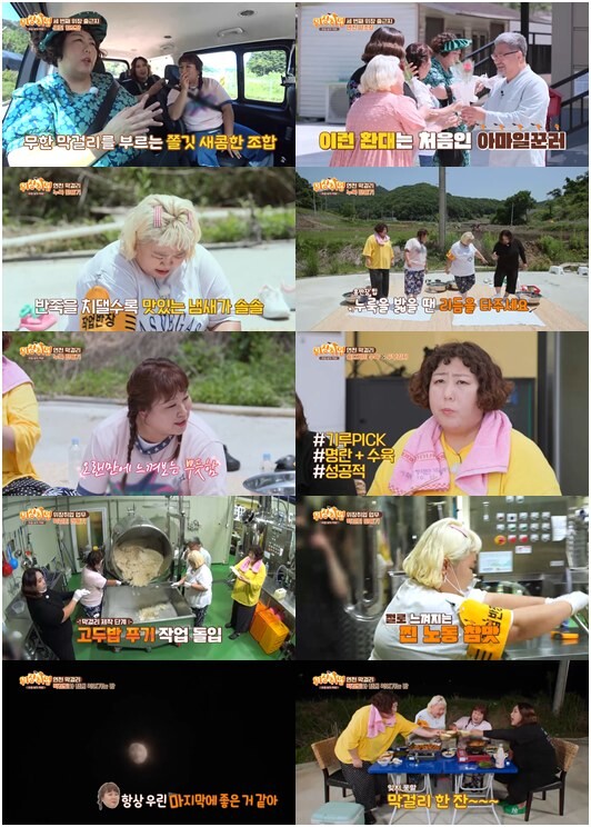 모든 일을 마친 뒤, 4인방은 불 막창과 곱도리탕, 그리고 직접 만든 막걸리를 곁들여 푸짐한 저녁 식사를 했다. 폭풍 먹방 중, 풍자는 “혹시 막걸리 먹고 실수한 적은 없느냐?”라고 물었다. 이때 신기루는 “없다”라고 단호하게 답했는데, 풍자는 “기루 언니 주사 있다. 남이 음식을 안 먹으면 엄청 서운해 한다”라고 폭로했다. 신기루는 “맞다. 음식이 눈앞에 없으면 불안하다”라고 덧붙였다. 그러자 홍윤화는 “예전 ‘웃찾사’ 회식 때 기루 언니가 술집에서 모든 메뉴를 다 시킨 적이 있다”라고 증언했다. 신기루는 “그건 취해서 시킨 게 아니라, 먹고 싶어서 시킨 것”이라고 강조, 음식에 진심인 마음을 드러냈다.