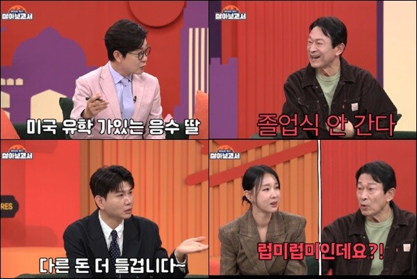쇼츠 속 김응수는 연예계 대표 ‘딸바보’임에도 “딸 졸업식에 가기 싫다”고 돌발 선언한다. MC 김성주가 “따님이 미국에서 공부 중인데 졸업식은 가셔야 하지 않냐?”라고 묻자, “5월 14일에 졸업하는데, 전 안 갈 거다”라며 불참을 선언하는 것. 이에 MC 이지혜와 제이쓴은 “딸 졸업식에 아버지가 안 가면 어떡하냐?”며 대리 걱정을 하고, 그럼에도 김응수는 “비행기를 장시간 타는 게 싫다. 그래서 저는 안 가는 걸로 했다”고 단호하게 답한다. 김응수가 장거리 비행에 거부감을 드러낸 이유가 무엇인지, 그리고 어떤 ‘해외살이 로망’을 갖고 있을지에 궁금증이 모아진다.