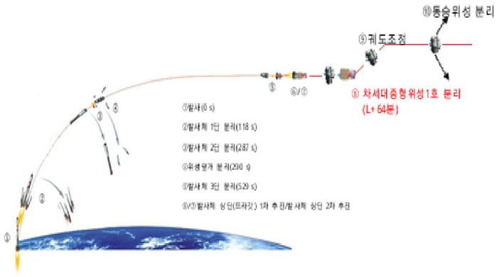 한국항공우주연구원(항우연)은 지상국과의 교신을 통해 차세대중형위성 1호의 본체 시스템 등 상태가 양호함을 확인했고, 발사체를 통해 도달하는 최초의 타원궤도(근지점 484km, 원지점 508km을 형성)에도 성공적으로 안착한 것을 확인했다고 설명했다.