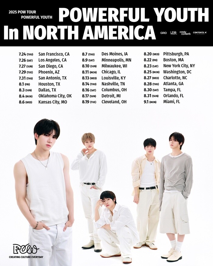 투어 타이틀은 ‘POWERFUL YOUTH(파워풀 유스)’. 팬덤명 ‘파워(Power)’에서 영감을 얻은 이번 타이틀은, 청춘의 에너지와 팬들과의 교감을 무대 위에서 고스란히 보여주겠다는 포부를 담았다. LA, 뉴욕, 시카고, 보스턴, 마이애미 등 미국 주요 도시를 포함한 총 27개 도시에서 열리는 이번 투어는 파우(POW)의 뜨거운 에너지와 존재감을 입증하는 무대가 될 것으로 기대를 모은다.