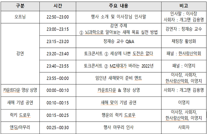 ▲ 오는 31일 밤 10시50분부터 새해 1월 1일 0시30분에 열릴 '메타버스 서울 제야의 종 페스티벌' 세부 일정. [서울시 제공] |