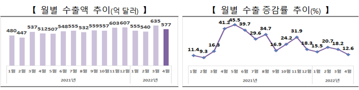 1일 산업통상자원부가 발표한 ’2022년 4월 수출입 동향‘에 따르면 지난달 우리나라 수출액은 지난해 동월 대비 12.6% 증가한 576억9천만 달러를 기록했다.