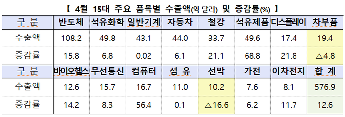 ▲ 4월 15대 주요 품목별 수출액 및 증감률. [산업통상자원부 제공] |