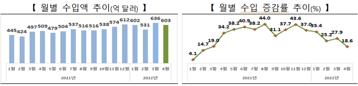4월 수입은 603억5천만달러로 두 달 연속 600억 달러를 넘었다. 다만 3월 수입액(636.2억 달러)보다는 약 33억 달러가 적다.