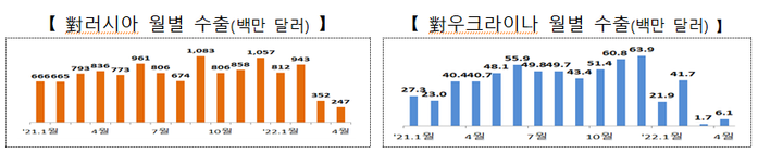 ▲ 대 러시아 월별 수출과 대 우크라이나 월별 수출 추이. [산업통상자원부 제공] |