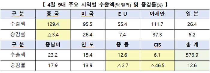 ▲ 4월 9대 주요 지역별 수출액 및 증감률. [산업통상자원부 제공] |