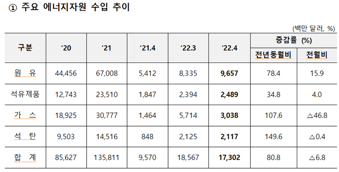 원유·가스·석탄 에너지 수입액은 지난해 4월의 77.2억달러보다 무려 70.9억달러나 급증한 148억1천만 달러로, 수입 증가세를 주도하며 적자 발생에 가장 큰 영향을 미쳤다.