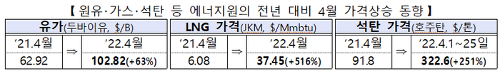 ▲ 원유, 가스, 석탄 등 3대 에너지원의 전년 대비 4월 가격상승 동향. [산업통상자원부 제공] |
