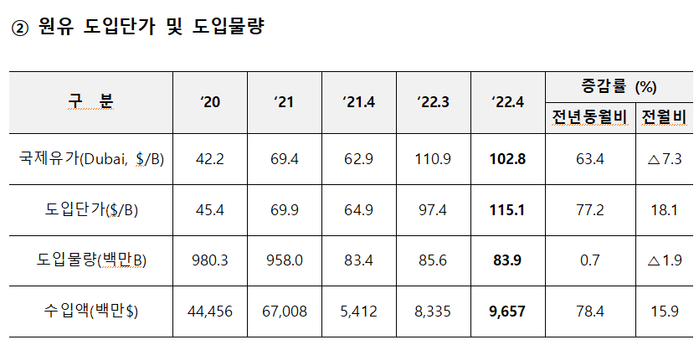 ▲ 원유 도입단가 및 도입물량. [산업통상자원부 제공] |